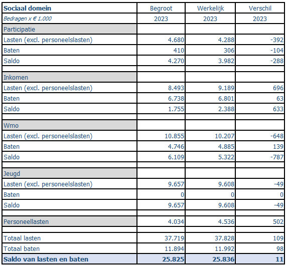 In onderstaande tabel is onderscheid gemaakt in de verschillende beleidsterreinen binnen het taakveld Sociaal domein.
